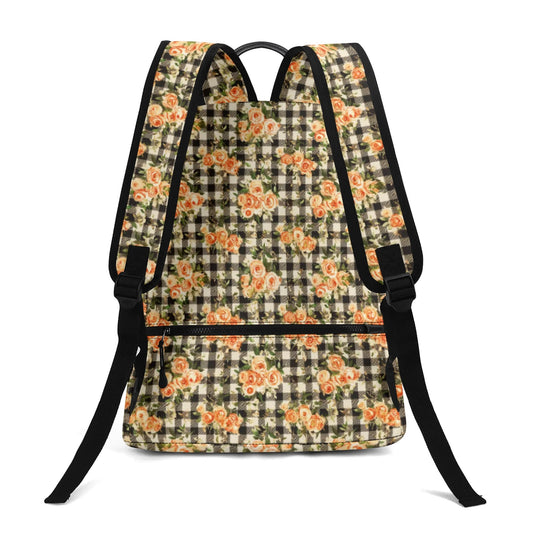 Vampire Art Retro Chic Vegan Leather 17 inch Back to School Twill Backpack - Vintage Black Gingham with Orange Flowers