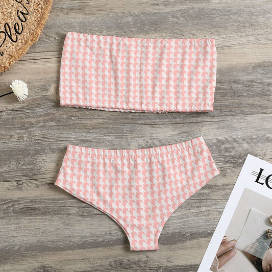 Vampire Art Classic Retro Houndstooth in Coral Pink & White Women's Strapless Bikini Swimsuit