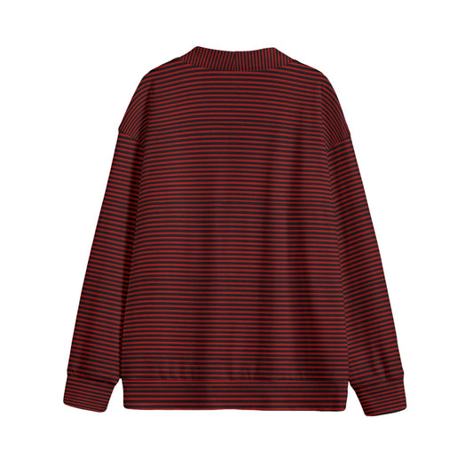 Vampire Art Black and Red Breton Stripes Unisex V-neck Knitted Fleece Cardigan With Button Closure
