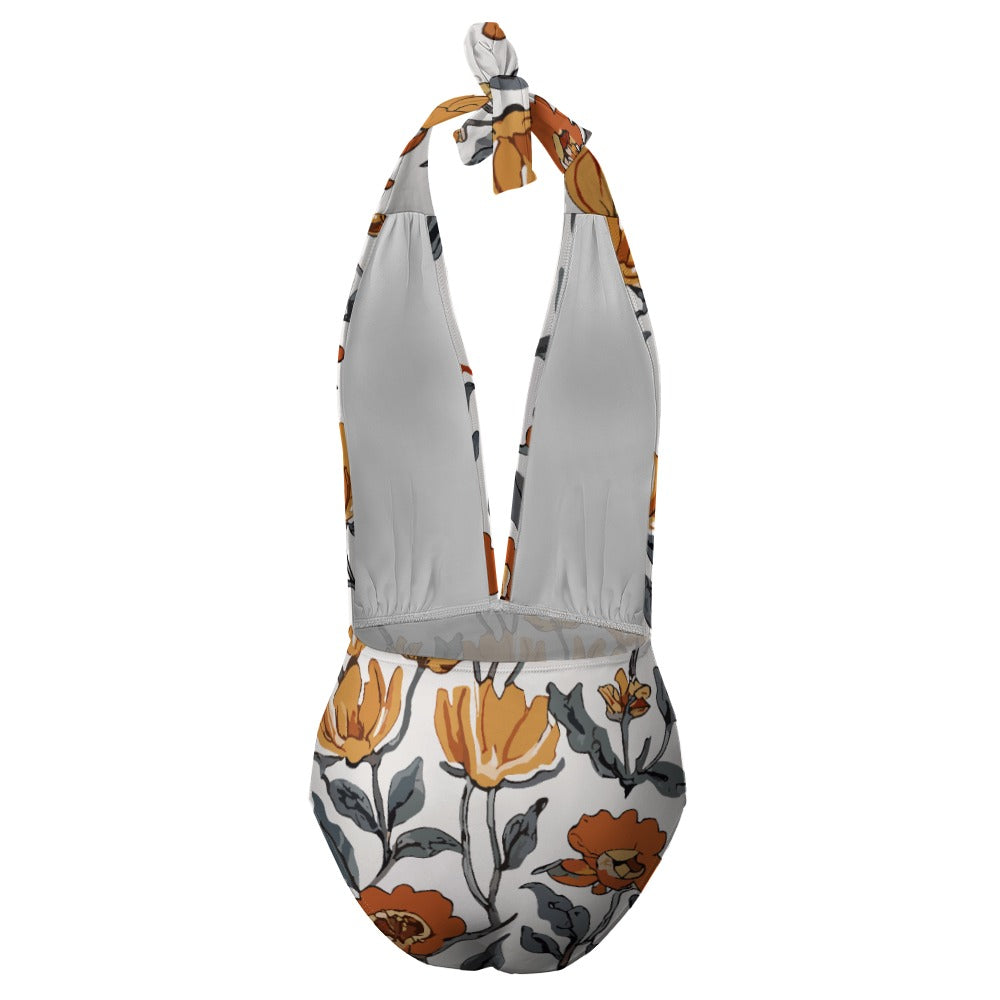 Vampire Art Retro Chic Floral Ladies Halter One Piece Swimsuit - Art Nouveau White and Orange
