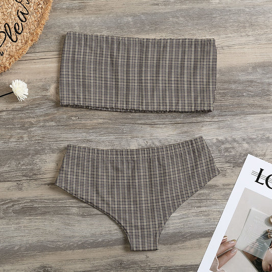 Vampire Art Dark Academia Beige Vintage Tartan Women's Strapless Bikini Swimsuit