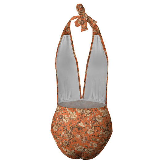 Vampire Art Retro Floral Romance Halter Plunge One-Piece Swimsuit - Terracotta