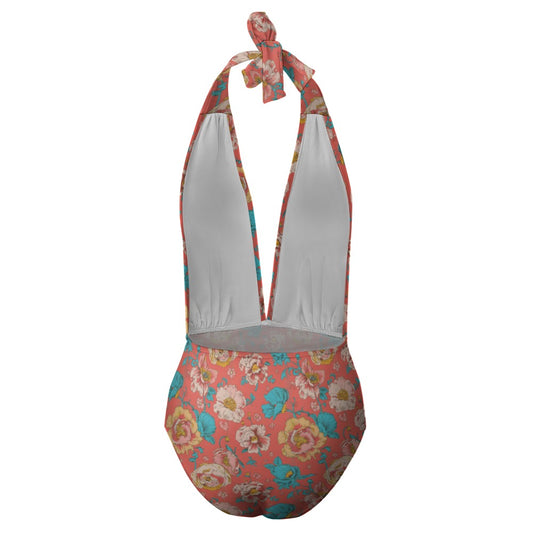Vampire Art Retro Floral Romance Halter Plunge One-Piece Swimsuit - Coral with Blue