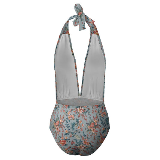 Vampire Art Retro Floral Romance Halter Plunge One-Piece Swimsuit - Dusty Blue
