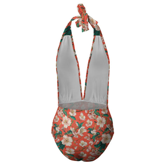 Vampire Art Retro Floral Romance Halter Plunge One-Piece Swimsuit - Cherry Blossom