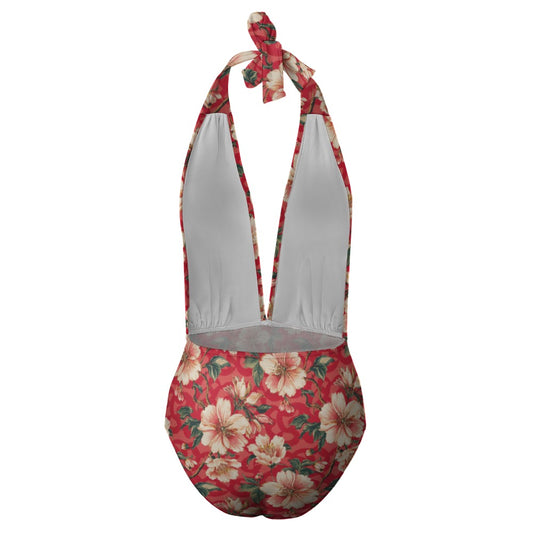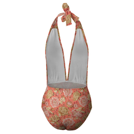Vampire Art Retro Floral Romance Halter Plunge One-Piece Swimsuit - Salmon Pink