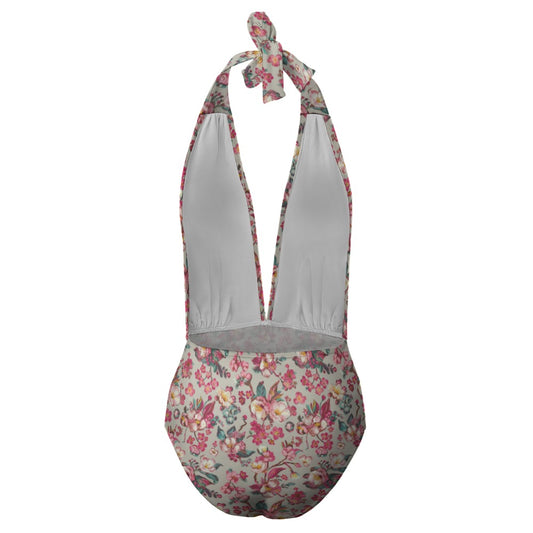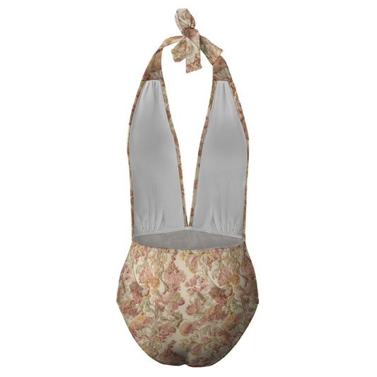 Vampire Art Retro Floral Romance Halter Plunge One-Piece Swimsuit - Cream