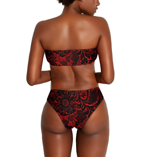 Vampire Art Two Piece Bandeau Strapless Retro Bikinis Swimsuit - Dark Academia Black and Red Lace Print