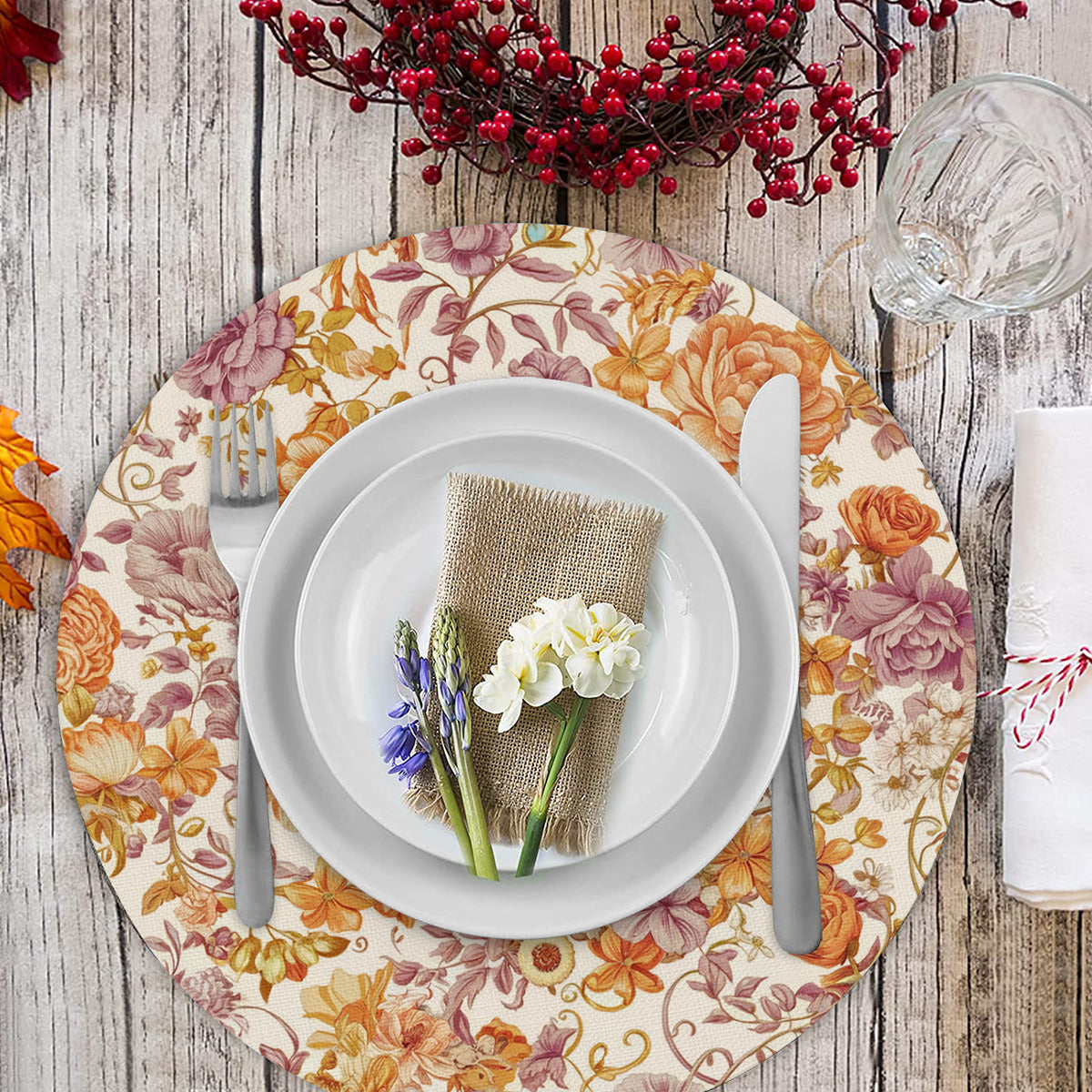 Vampire Art Retro Linen Round Placemats - Delicate Florals in Orange and Lilac