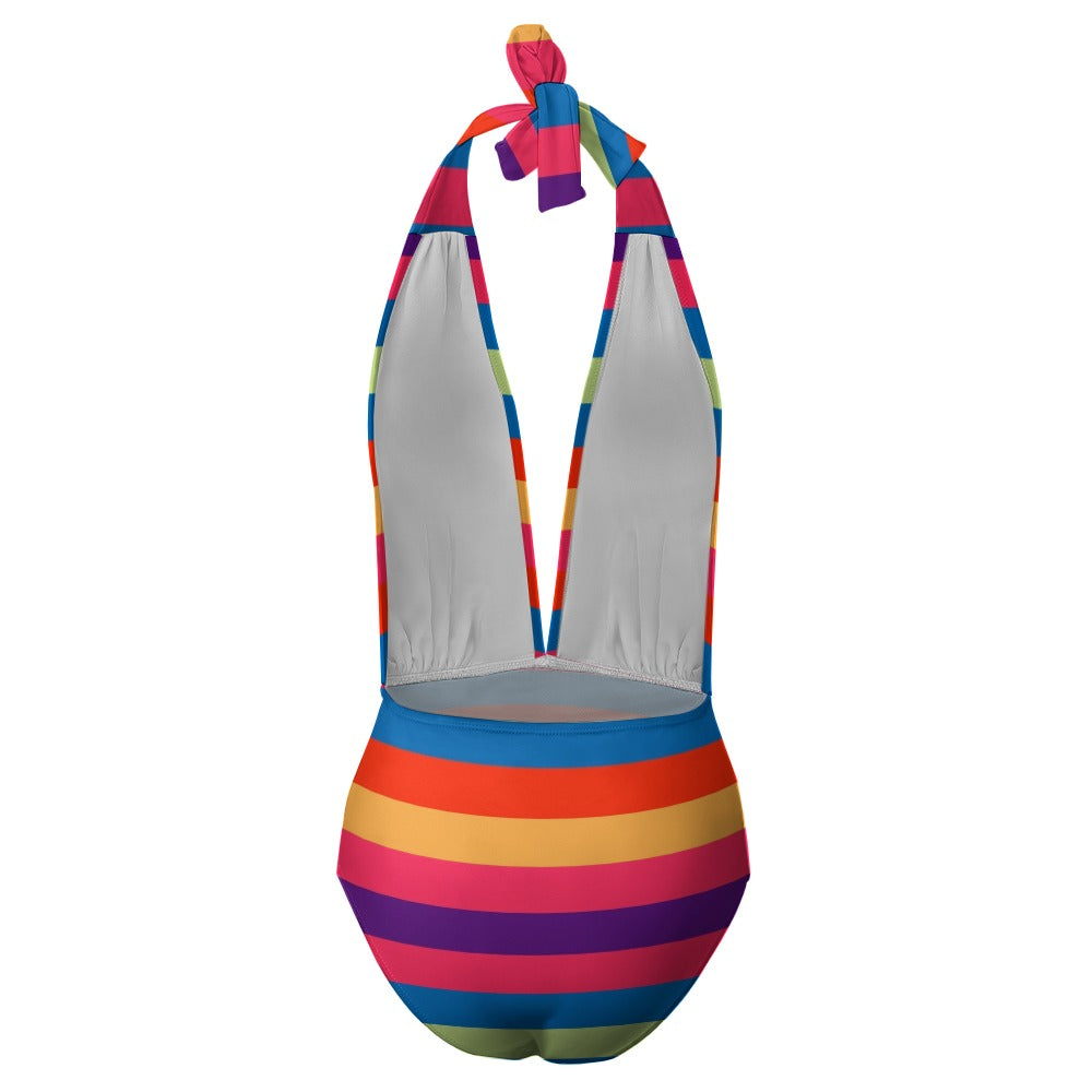 Vampire Art Retro Ladies Halter One Piece Swimsuit - Bold Sixties Red Stripes