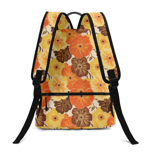 Vampire Art Retro Chic Vegan Leather 17 inch Back to School Twill Backpack - 1970s Florals in Brown, Yellow and Orange