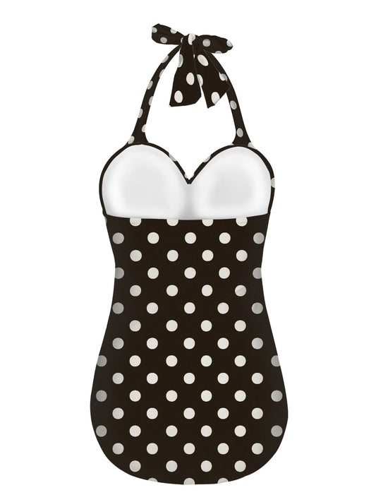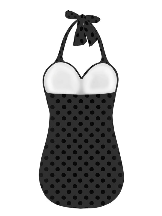 Vampire Art Vintage Chic Halter Neck One-Piece Swimsuit - Charcoal Polka Dot