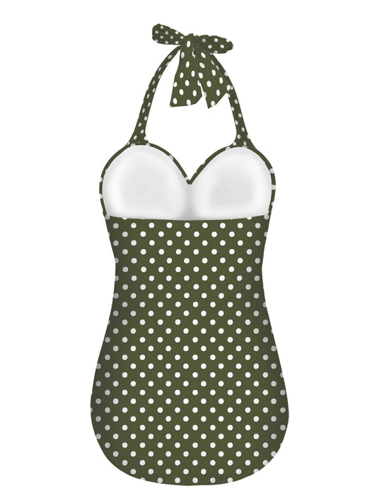 Vampire Art Vintage Chic Halter Neck One-Piece Swimsuit - Olive Green Retro Polka Dot