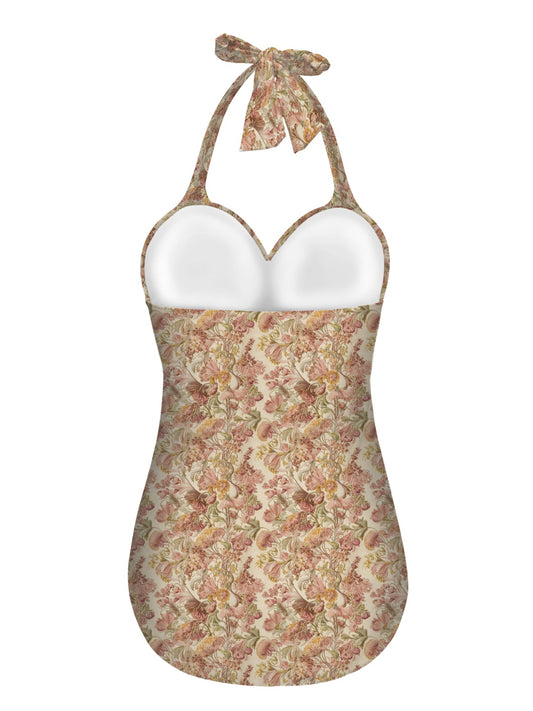 Vampire Art Vintage Chic Halter Neck One-Piece Swimsuit - Vintage Florals in Cream