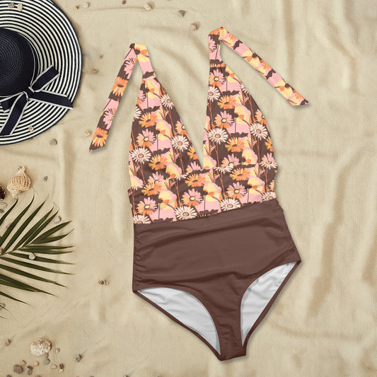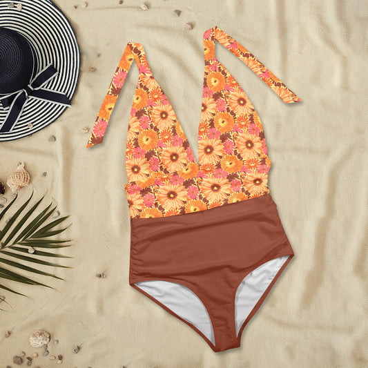 Vampire Art Glam Plunge Halter Backless Swimsuit - 1970s Orange Florals with Brown