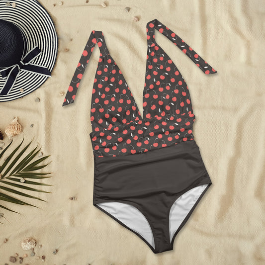Vampire Art Glam Plunge Halter Backless Swimsuit - Cherries with Black