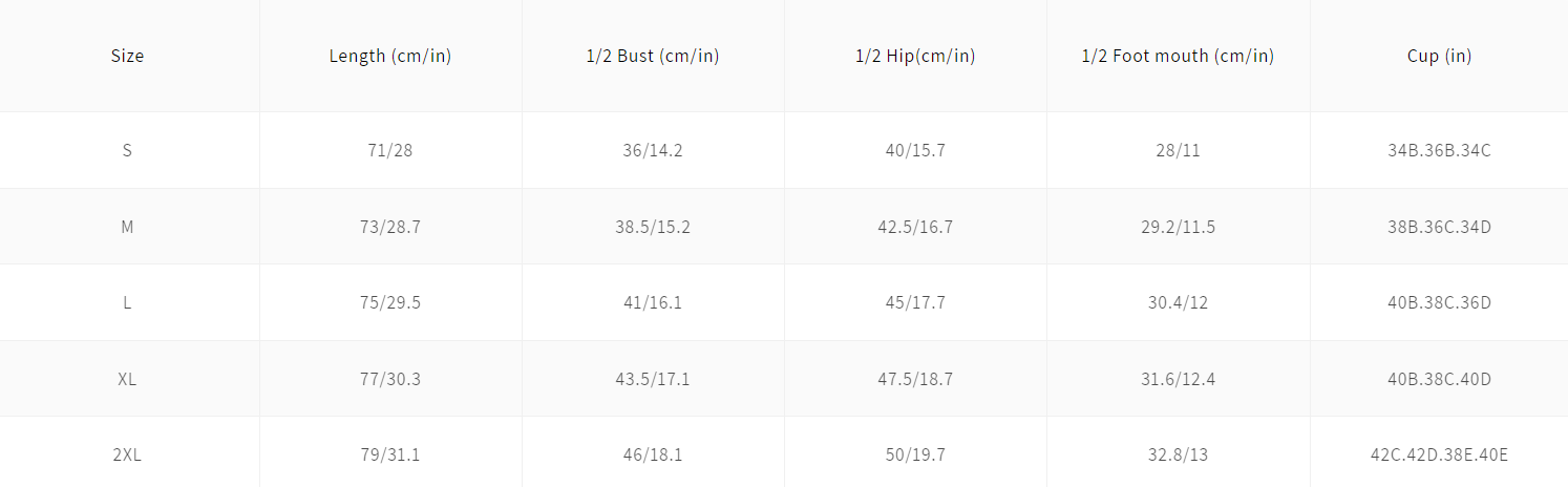 | 2XL | 79/31.1 | 46/18.1 | 50/19.7 | 32.8/13 | 42C.42D.38E.40E |