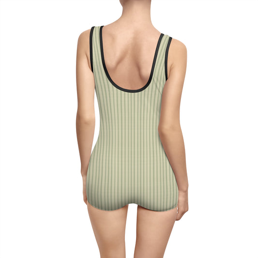 Vampire Art Women's Vintage Swimsuit - Khaki Vertical Thin Grandad Stripes