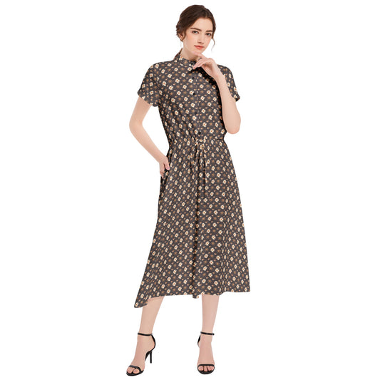 Vampire Art Retro French-style A-line Drawstring Flared Casual Midi Dress - Seventies Floral Brown