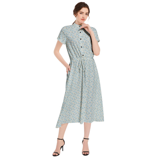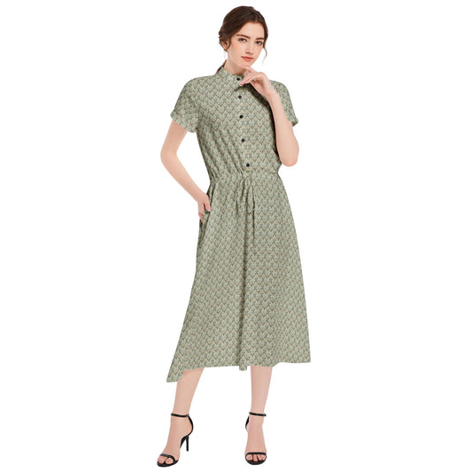 Vampire Art Retro French-style A-line Drawstring Flared Casual Midi Dress - Ancient Khaki Floral