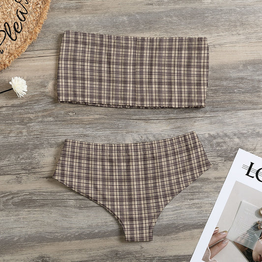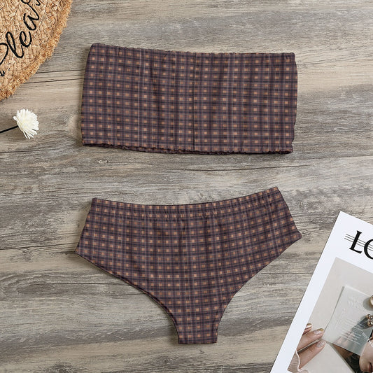 Vampire Art Dark Academia Brown Chequered Vintage Tartan Women's Strapless Bikini Swimsuit