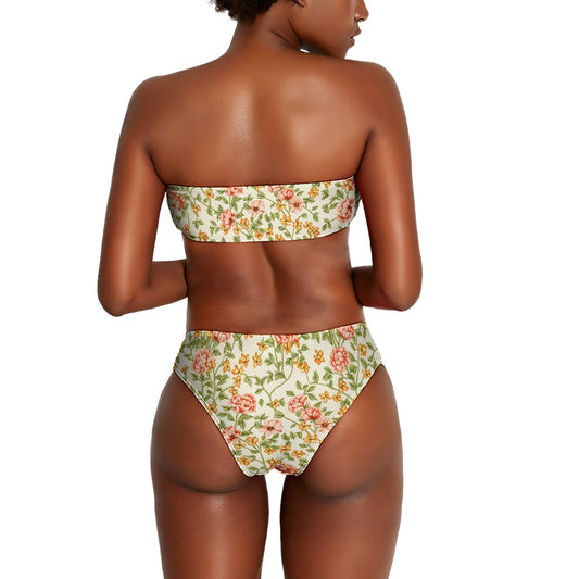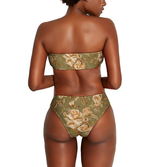 Vampire Art Two Piece Bandeau Strapless Retro Bikinis Swimsuit - Chic Vintage Florals in Khaki