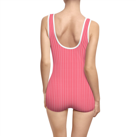 Vampire Art Women's Vintage Swimsuit - Magenta Red Vertical Thin Grandad Stripes