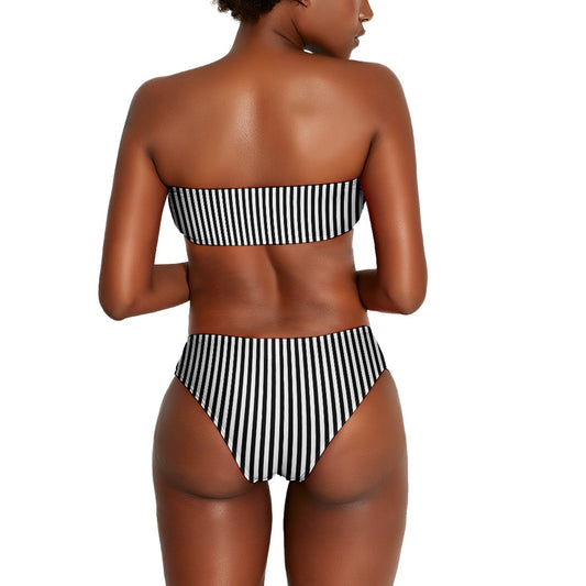 Vampire Art Two Piece Bandeau Strapless Retro Bikinis Swimsuit - Preppy Black and White Vertical Stripes