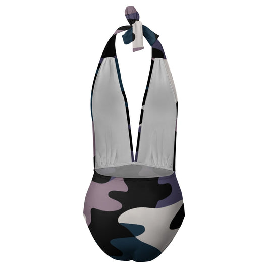 Vampire Art Retro Ladies Halter One Piece Swimsuit - Purple and Black Camo