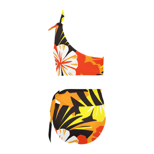 Vampire Art Retro High Waisted One Shoulder Bikini Set - Bold Yellow and Orange Sixties Surfy Florals
