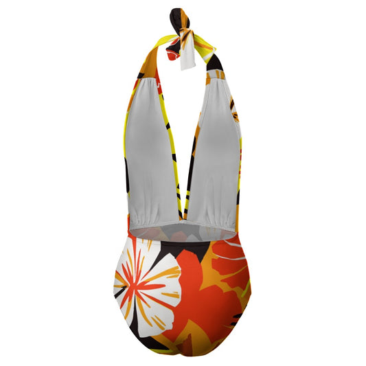 Vampire Art Retro Ladies Halter One Piece Swimsuit - Bold Sixties Florals in Yellow and Red