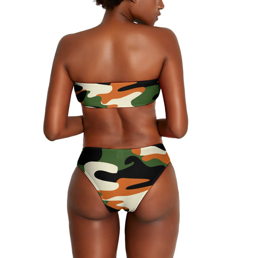 Vampire Art Two Piece Bandeau Strapless Retro Bikinis Swimsuit - Eighties Camo with Orange