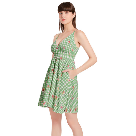 Vampire Art Vintage Bloom Gingham Flare Dress - Green Floral Gingham