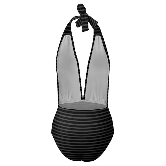 Vampire Art Retro Ladies Halter One Piece Swimsuit - Black and Charcoal Stripes