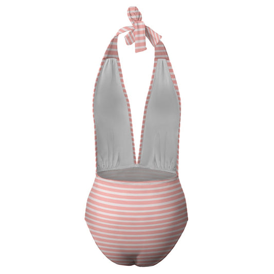 Vampire Art Retro Ladies Halter One Piece Swimsuit - Pastel Pink Breton Stripes