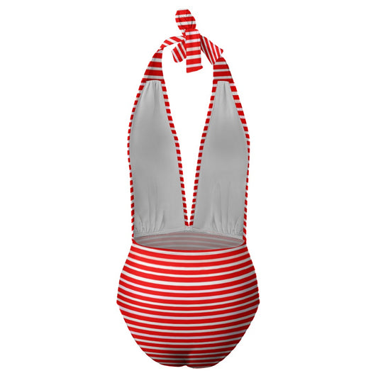 Vampire Art Retro Ladies Halter One Piece Swimsuit - Red and White Breton Stripes