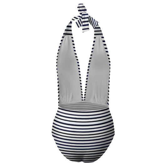 Vampire Art Retro Ladies Halter One Piece Swimsuit - Classic Breton Stripes