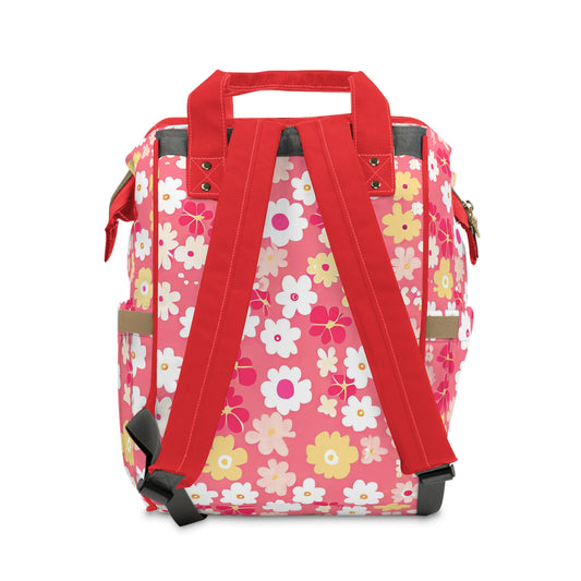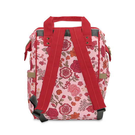 Vampire Art Multifunctional Baby Diaper Backpack Changing Bag - Seventies Flowers Red and Pink