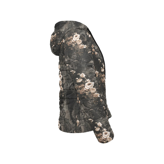 Vampire Art Urban Gothic Women's Padded Hooded Jacket - Grunge Black Lace and White Roses
