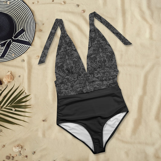 Vampire Art Glam Plunge Halter Backless Swimsuit - Grunge Damask and Black