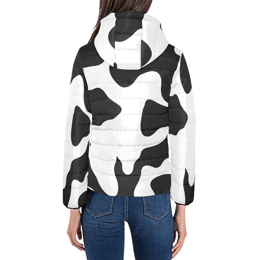Vampire Art Grunge Animal Patterned Women's Padded Hooded Jacket - Black and White Cowhide