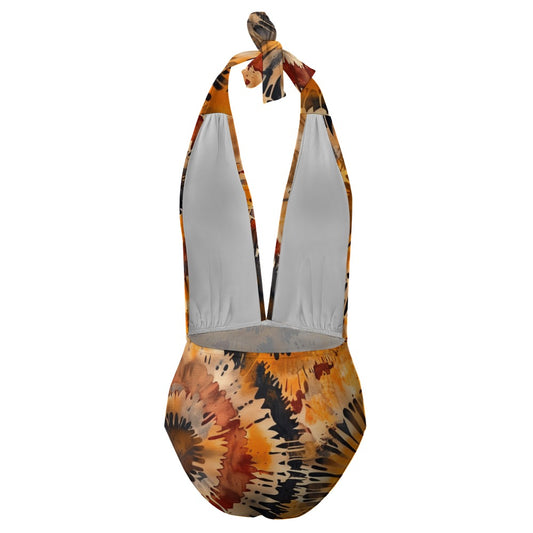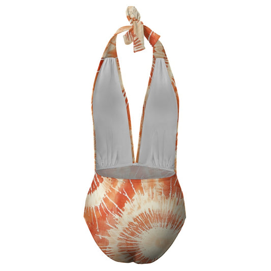 Vampire Art Hippie Tie-Dye Motif Festival Boho One Piece Halter Swimsuit - Orange