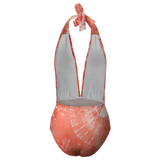Vampire Art Hippie Tie-Dye Motif Festival Boho One Piece Halter Swimsuit - Coral