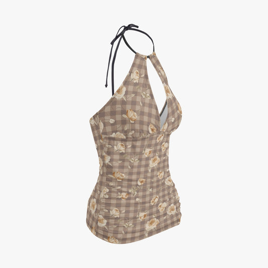 Vampire Art Retro Halter Two-Piece Tankini Swimsuit - Taupe Floral Cottagecore Gingham