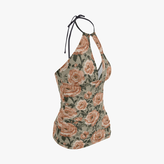 Vampire Art Retro Halter Two-Piece Tankini Swimsuit - Grunge Roses in Olive and Coral