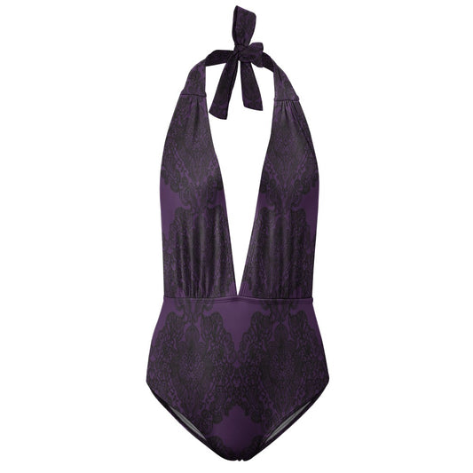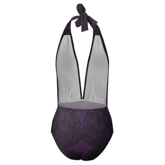 Vampire Art Retro Floral Romance Halter Plunge One-Piece Swimsuit - Black Lace over Purple