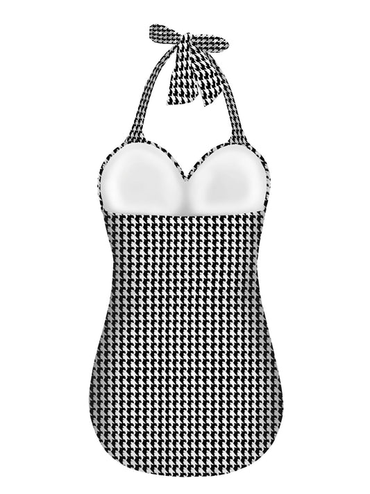Vampire Art Vintage Chic Halter Neck One-Piece Swimsuit - Black and White Houndstooth