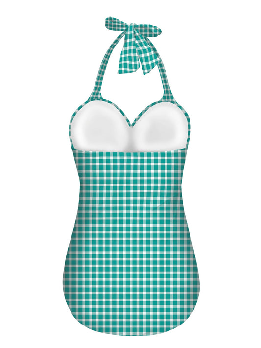 Vampire Art Vintage Chic Halter Neck One-Piece Swimsuit - Aqua Gingham