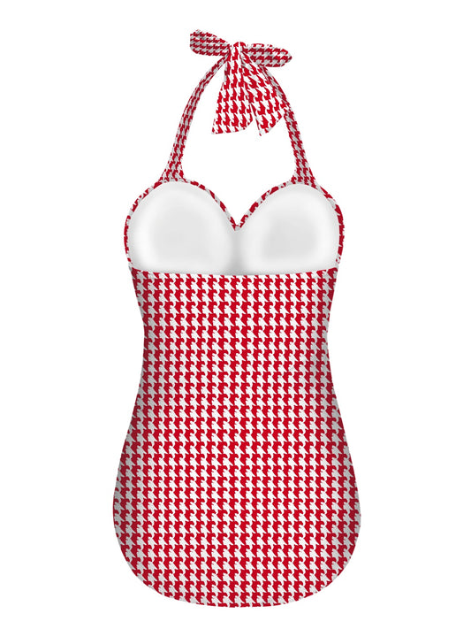 Vampire Art Vintage Chic Halter Neck One-Piece Swimsuit - Cottagecore Red Houndstooth
