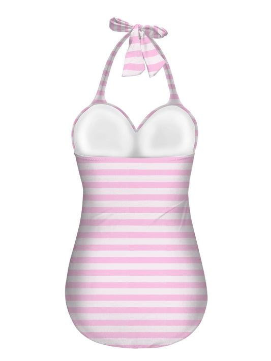 Vampire Art Vintage Chic Halter Neck One-Piece Swimsuit - Pink Stripes